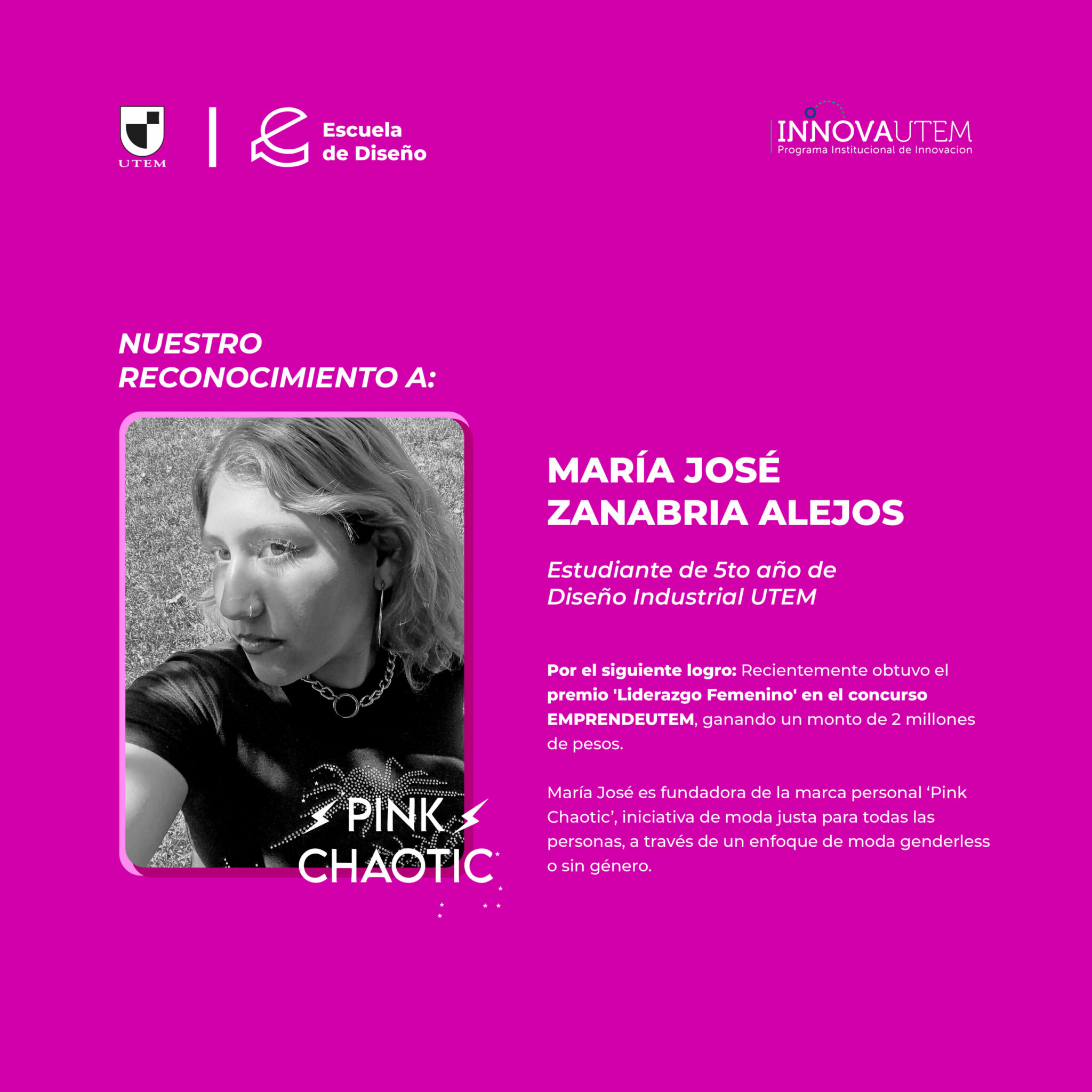 🏆 En ese sentido, Zanabria fue la ganadora en la categoría ‘Liderazgo Femenino’ con su emprendimiento ‘Pink Chaotic’ @pink.chaotic, una propuesta vinculada a la economía circular, donde confecciona líneas de vestuario genderless (sin género) a través del ‘upcycling’, una técnica de reutilización de prendas que les brinda una nueva vida útil. Pink Chaotic se dirige a las personas que buscan sentirse seguros/as con su cuerpo, por medio de una identidad única. El premio otorgado fue de $2.000.000, los cuales serán invertidos en nueva maquinaria, espacios y elementos que ayudarán a la customización de productos.