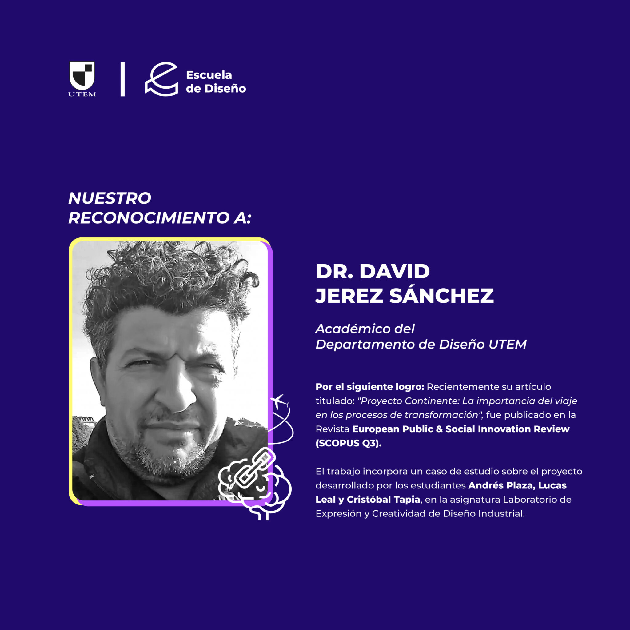 Queremos reconocer a nuestro académico de Diseño Industrial Dr. David Jerez Sánchez, con motivo de que su artículo titulado ‘Proyecto Continente: La importancia del viaje en los procesos de transformación’, fue recientemente publicado en la Revista European Public & Social Innovation Review (SCOPUS Q3).